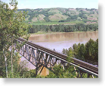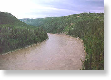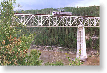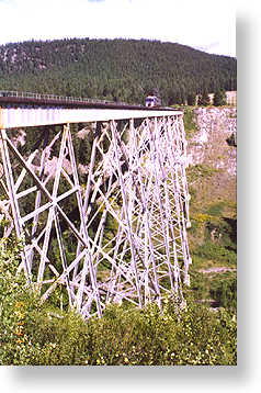 We arrived about 10 PM, and the bus picked us up at the railyard. We saw milepost 1 of the Alaskan Highway, and then found the only place in town still open -- a Boston Pizza. We almost had an international incident, as the couple from the Netherlands was the last to be served, and they couldn't order any beer because the bar had to close at 10:30. Boy, were they hot! In all seriousness, everyone was a little tired. This long, long push to get as far as we can is just a bit too much. I heard that this trip was originally a nine day trip and was shortened to six days this time, but the route stayed the same. It is just too long to be riding. It becomes an endurance test instead of a rail vacation. They bussed us to Chetwynd and we got into the motel at 1 AM. Only to find that the A/C didn't work in my room. I was too tired to complain so figured I'd straighten it out in the morning. June 24 I overslept slightly. My body clock has caught up, and my cold is abating. My room was moved to fix the A/C problem and I hoofed it over to a local restaurant for breakfast. One thing about the meals since we got back to the U.S.: The portions are huge. It's no wonder so many people are overweight. We decided not to take the optional side trip to the Fort Bennet Dam powerhouse today and are just going to chill around the area. I called the local office of BC Rail, and talked with a guy named Dan Carter, who put me in touch with Tony Simones, who in turn fixed us up with Troy Davis and a highrailer to go look at the Peace River Bridge. It was an impressive thing and vistas were once again -- stunning. Troy said that sunset down the valley, as seen from the bridge was unbelievably beautiful.