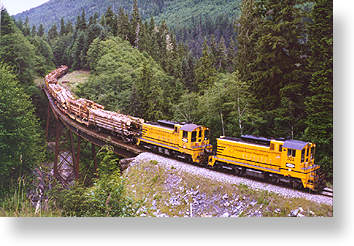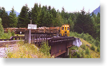June 29 The weather was back to normal today, with gray skies and rain. We saddled up and headed up to Horseshoe Bay for the ferry ride to Nanaimo, which took about 90 minutes. We shot some stuff as we went to put into the CanFor segment, and got off the ferry about 12:40. The ferries, by the way, hold lots of vehicles, including semi's, buses, and the usual spate of campers. Then it was a drive up to Campbell River along the shore of Vancouver Island. I'm not sure what I expected, but it mostly looks like an imitation of the Northern Wisconsin resort areas, complete with go-kart tracks. The motel is fine, and the sun is out up here. The town closed at 4 PM so it's notes and dinner. Cash is getting short. We are all pretty tired. The number of miles had more of a debilitating effect that I would have anticipated. Only a few more days. Perhaps Woss Lake will be a little more rustic. June 30 We checked out of the motel late and proceeded to drive up to Woss Lake. Once we left Campbell River, civilization seemingly faded in the rear-view mirror. If you like trees and the woods, you would love it here. Because that's all there is. The motel at Woss Camp is brand new. It has TV, but no telephones. And the area consists of the motel, and a gas station/general store/restaurant/video rentqal shop/bar. For something to do, we drove to Port Alice at the end of the island. Small towns, with apparently a high teenage pregnancy rate. I guess there just isn't much else to do up here. It's pretty country, but my idea of an Internet cafe would probably fall flat. Back to the motel, dinner, which was surprisingly expensive. I guess everything has to be ferried and trucked in. It may be a long couple of days here. But it may be very relaxing. I'll be glad to get back to work tomorrow. It will feel good to be doing something other than traveling. July 1 An interesting day, was this. We got out for the usual 8:30 call and found our contact, Mike Gaudet, at the rail office, which was just down the hill from the motel. And he proceeded to tell us that all the people we were supposed to talk to were not in. Nor was the passenger train running. In fact, it hadn't run in just under two years. I was about ready to pack it up and move on. But we went out to shoot some static shots of the steam locomotive, a nicely polished Mikado (2-8-2) and before we knew it, the operation superintendent was at our side, as were the forestry expert, and the operations engineer. The superintendent, Dave Summers, gave a good on-camera talk, and then proceeded to take us all over the area, extolling the benefits of logging, and how they respect the environment while still keeping a self renewing operation in progress. It was a little unnerving to be blasting along on the logging roads, sharing with big, big log rigs, while Dave was pointing out some interesting tidbit. I'm not a good rider.