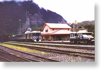 June 21 We are just coming off our adventure in Zimbabwe, so this is the longest air journey I have taken - at least to date. We flew from Harrare to Johannesburg, to Frankfurt to Detroit to Minneapolis to Vancouver. Barb wisely departed the trip in Detroit. So we have no clue were we are. Finding the hotel was a treat at 3 AM. I do remember getting stopped at a sobriety checkpoint, and after I explained what we were about, the RMCP gratiously pointed us in the direction of our hotel. I woke up several times thinking I was still flying. I did get up and start to try to track down the luggage about 7:30 AM. I wonder how I will feel later today. [Later] I just tracked down the luggage and we will receive it this afternoon. Then it's laundry time. This rail fan/adventure trip was organized by my friend Chris Skow, of Train Trips Unlimted. We drove up to the tour start motel, and found that it was generally more central to our needs than the other. So I canceled all our reservations with Best Western and moved into the Canyon Court. And then we spent the day off continuing the Great Pez Hunt. John found that a local drug store chain carries Pez, and they had a lot of the body parts packages. So we hit a bunch this morning, and then had lunch at Burger King, just to get back into American fast food. Boy, was it good! Not very healthy, but really delicious. I spent the afternoon catching up on notes, and waiting for the luggage to arrive (which it finally did at about 5 PM), and John and Gary continued to slay the mighty Pez. Nothing like a new, avid collector with a credit card. Just like me and trains. They hit about ten more stores, and found more items that aren't available in the U.S. -- and found some Pez Heads as well. One was a stocker in one store and said that his brother sold them from a web site. John and I went to a water side pavilion, whre they had the signs pointing to different parts of the world and the distances. The furthest was Johannisburg! The tour starts tomorrow. Laundry is done, my cold seems better (we'll see tomorrow) and all is right with the world. Africa seems a long time ago, and far, far away. Vancouver is a pretty place though, where the clouds hang like smoke against the hills. It's rainy, which is a real change from the hot dryness of last week. We shall see what weather the next week brings. We are all dead after dinner. Time has caught up with us. June 22 Up early and out of the motel by 6:15 to Denny's (a place to go when there is nowhere else). We were on the bus by 7 AM and then to the train, where, true to form -- we got there an hour and a half late due to lack of provisions on the RDC-3. And not only were we delayed by that, but then we were blocked in by the Royal Hudson, a beautiful 4-6-4 steamer decked out in gold and maroon livery.