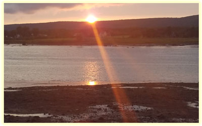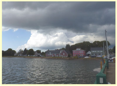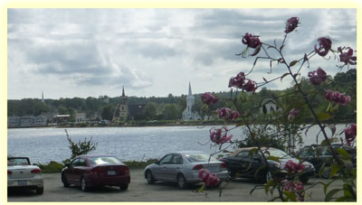 September 7 It rained as we crossed Nova Scotia today, with a first stop at Tim Horton's, a Canadian institution, in Bridgewater. Our stop after that was at Kijimkujik National Park. The fun is in the pronunciation – Kid Gee Mah Koo! Jik – although mostly shortened to “Keejee.” The park consisted mostly of trees, more trees, lakes and rain. We didn't see much sense in walking in the pouring rain, we just looked in the gift shop, and moved on. Our lunch stop was in Digby, from whence Digby scallops come. Who knew? And of course, lunch consisted of – scallops. So we had Digby scallops, in Digby. The final stop was Annapolis Royal.