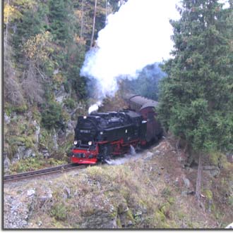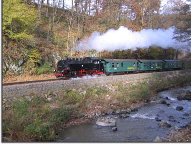 October 27 There is nothing quite like watching a tank locomotive do a water fill early in the morning. Well, maybe you have to be a railroad fan to really like this. Today we worked the line that runs through the Selke River Valley. The Selke is the longest of the rivers flowing out of the Harz Mountains.