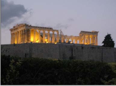 And there was the Parthenon – lighted, and looking just like a picture postcard. Of note, as in most Mediterranean countries, people dine late. I think the desk clerk was most amused at our 8 PM reservation. The food was good, the temperature perfect, and sights spectacular. Tomorrow we start our tour in earnest. September 3