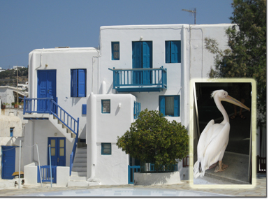Then on to lunch back in Mykonos, and a wander through the narrow twisting streets, with views of the sea, and hills.