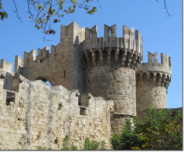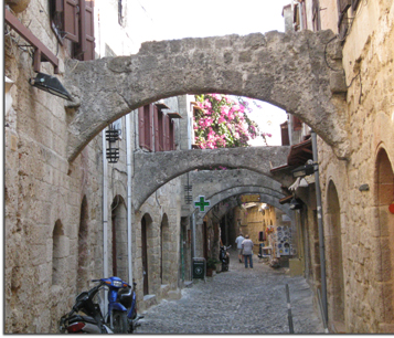 The fortress is pretty well pretty well preserved, with wonderful mosaic floors and coats of arms set into the building that housed the knights. So a palace and fortress dominate the old town, which is now a vast tourist area. We opted out of our trek to Lindos to see another Acropolis, and instead did a walking tour of the old town. Because the area is seismically active, the early buildings were all stabilized by archways over the streets. The practice continues today, over the narrow, winding passageways.