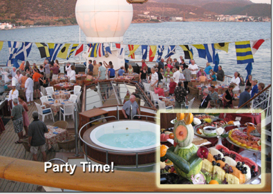 We got back to the ship in the early afternoon, and went swimming in the Aegean Sea. So that is now off our list of seas into which we have been. Tonight is a belly dancing demonstration, and the much publicized barbeque.