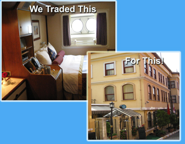 We docked and disembarked about two hours late. I called the hotel, which then sent a car for us. Initially, we thought that we were in the middle of nowhere. However, further investigation put us about three blocks from the Topkapi Palace, the Blue Mosque, and the whole Sultenahmet area. So we checked in, wandered a bit, had a light lunch, and of course, coffee in a street café.
