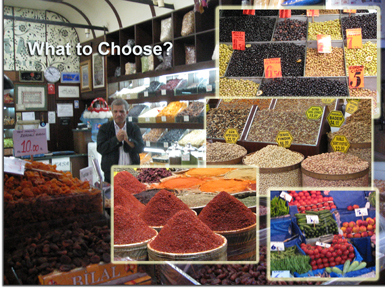 By the time we left the mosque, the wholesale portion of the spice market was open, and there were storefronts with mounds of spices, olives, nuts, cheese and other foodstuffs on display. It was quite colorful.