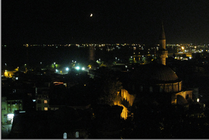 What was a highlight, was dinner on a rooftop restaurant. A crescent moon hung in the sky, and we overlooked the Bosporus. The lighted minarets reached toward the sky. It was a special moment.