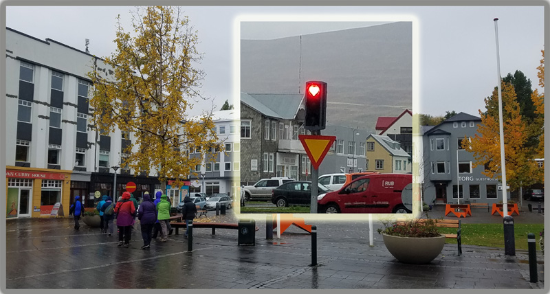 We walked into the city center and had a quick lunch at an Illy. I had a late breakfast with enough bacon to satisfy the entire state of Iowa. Note the Akureyri heart shaped stop lights. They were made to cheer people up during the 2008 economic crash and have now become rather a hallmark of the town.