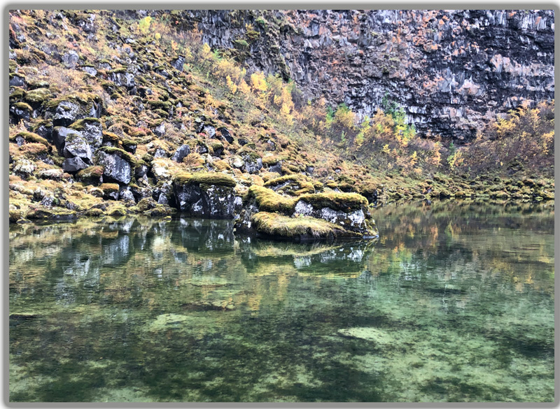 The end of the walk was a beautiful still pond. The water was glass smooth, and clear as can be. There were plenty of waterfalls feeding this. We did not see any fish. Iceland is apparently well known for it's trout fishing.