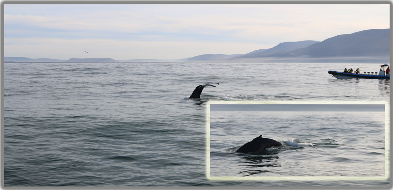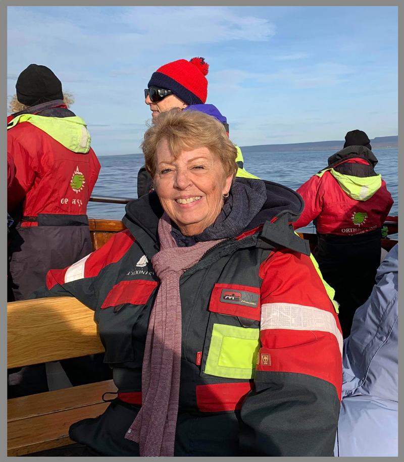 The final stop of the day was boarding a whale watching boat. The RIB boat was not operational so we were on a beautiful antique wooden scooner. We had to wear thermal coveralls, and by the time we were done, were thankful to have had them, as it was cold on the water. Barb here, is snug as can be in her very attractive thermal suit.
