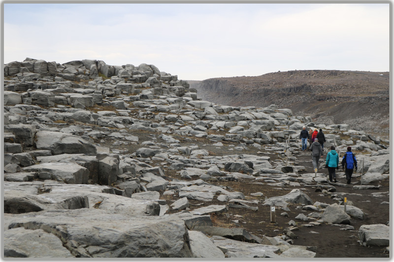 We had to navigate a rock field left by a glacial flood, with lots of large boulders just tossed around. The people on the right of the image will give you some idea as to the scale.